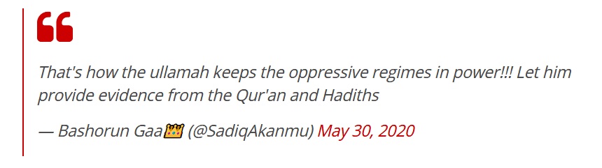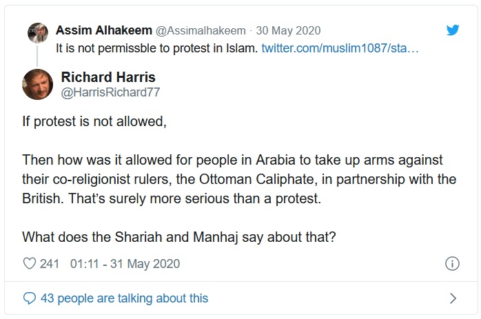 Al-Hakeem came under criticism by many Muslim users, with many citing Quranic principles of standing up against injustice, even were it to be from one’s own family. Other’s highlighted widely known prophetic narrations, such as: “Whosoever of you sees an evil action, let him change it with his hand; and if he is not able to do so, then with his tongue; and if he is not able to do so, then with his heart—and that is the weakest of faith”.